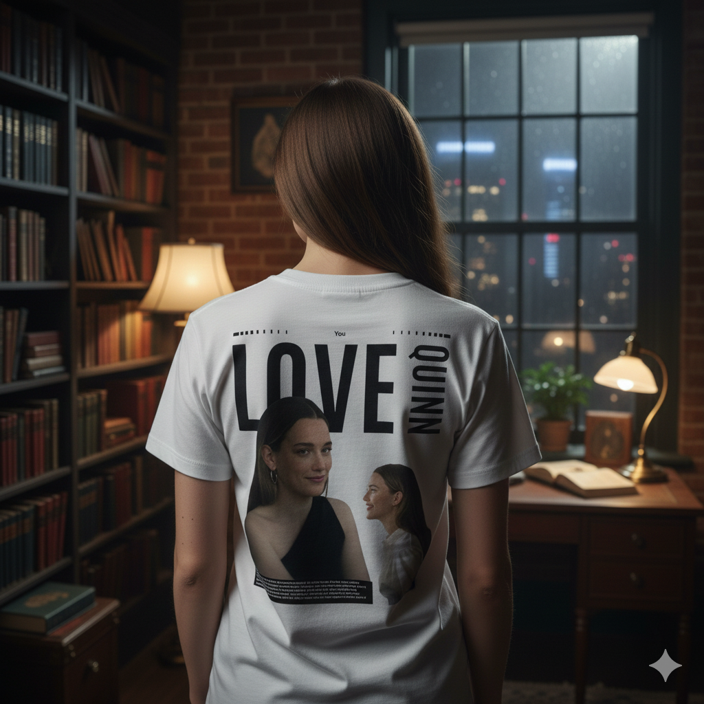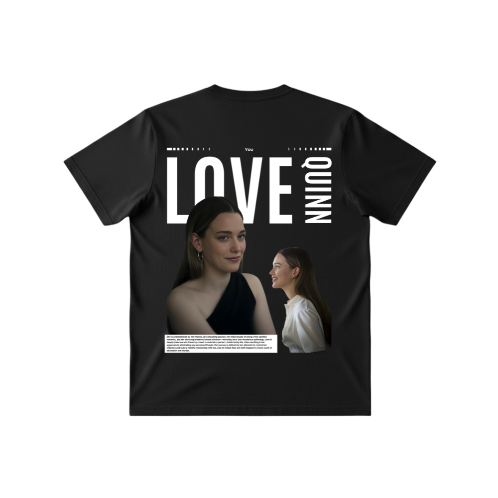 A dark, captivating tribute to Love Quinn — capturing her charm, intensity, and beautifully chaotic energy. Designed for fans who admire her sweetness, her darkness, and her unforgettable role in YOU.