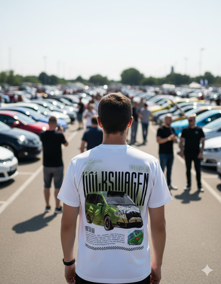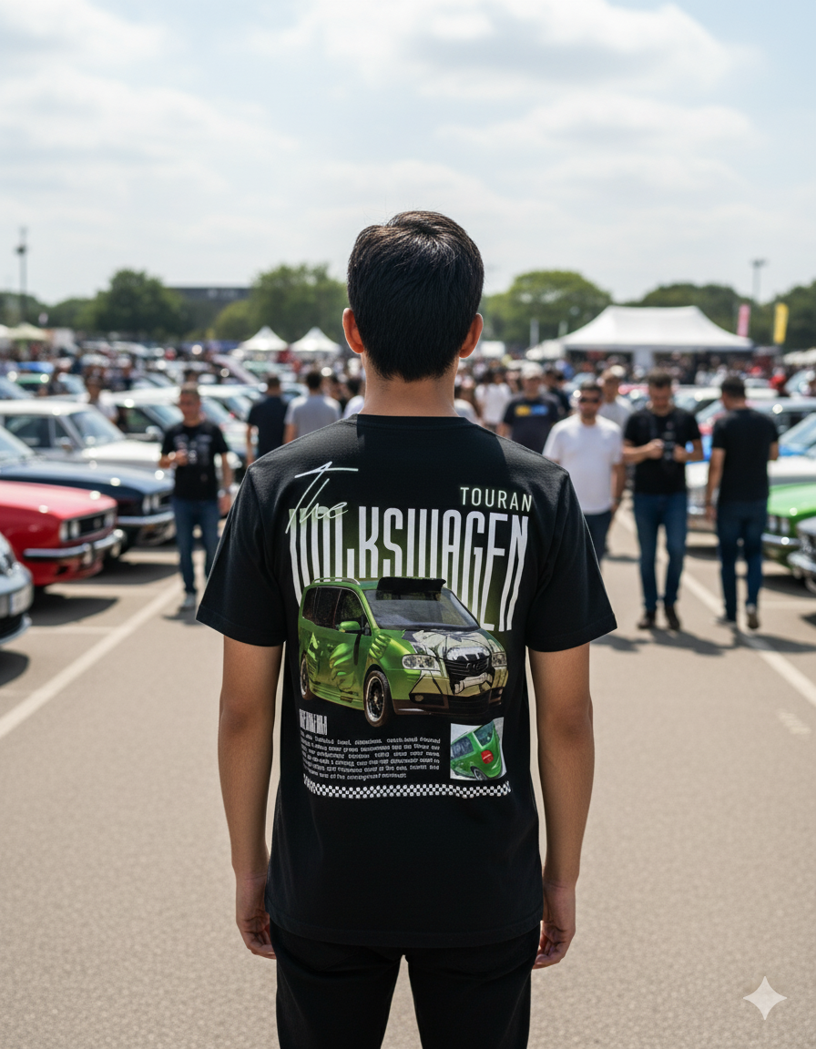 💥 Unique Styling, Serious Attitude: The graphic showcases the Touran’s unmistakable features from the film: the vibrant green and yellow digital camouflage wrap, the aggressive body modifications, and the massive speaker system that could shake the windows of any tuner car nearby. It represents the ultimate sleeper build—a family vehicle transformed into a street icon.